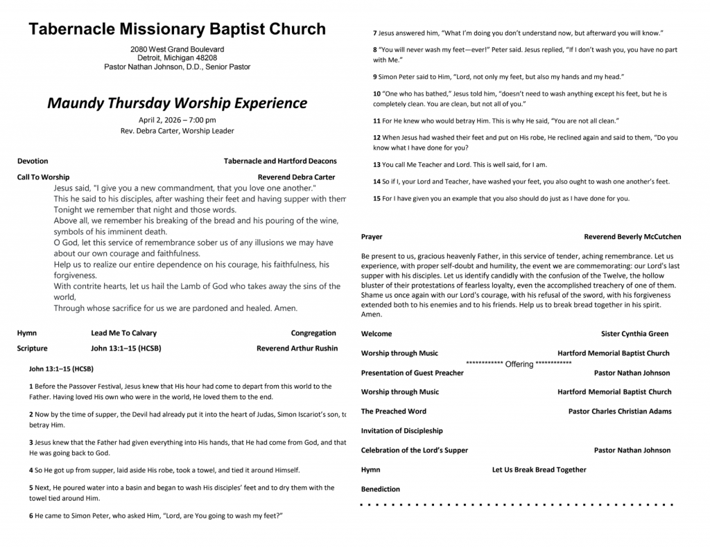 Thursday, April 2, 2026 – 7:00 p.m. – We are hosting the Hartford Memorial Baptist Church!